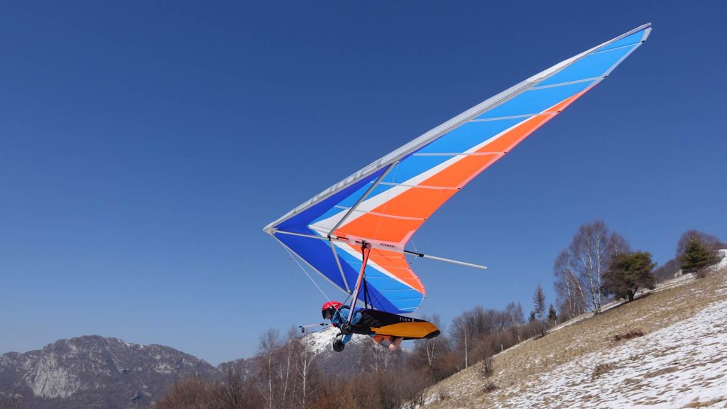 Sarà proprio vedendo uno di questi modelli che Alfio Caronti, insieme ad altri, ha l’idea di provare a decollare non più dall’acqua, ma correndo lungo un pendio per poi planare come un aliante sfruttando le correnti ascensionali che si creano in prossimità delle montagne.